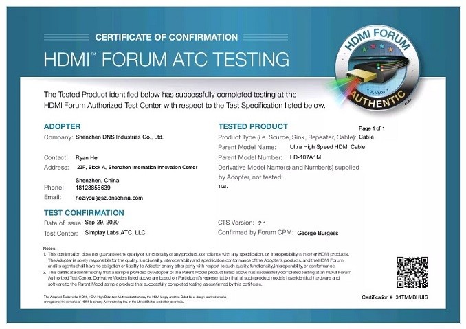 DNS于2020年9月29日獲得了HDMI協(xié)會頒發(fā)的HDMI 2.1認證證書,成為首批獲得UHS線纜認證制造商之一。
